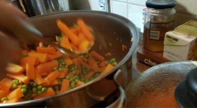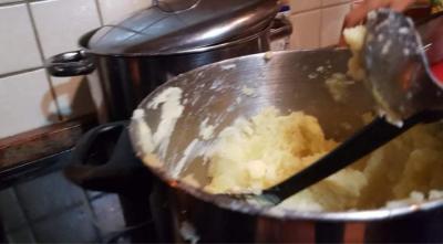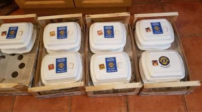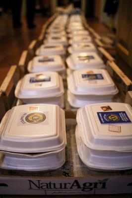 Sült csirkecomb, krumplipüré , vegyes zöldség (sárgarépa, cukorborsó) töltelék, barna mártás került a dobozokba: muffin, bejgli, szaloncukor, torta, almáspite és sokféle finom kenyér is emelte az ünnepi hangulatot.