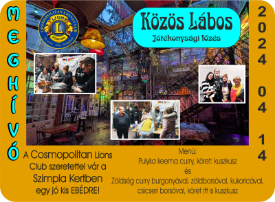 A Cosmopolitan Lions Club már 2 éve jószolgálati tevékenységei sorában - élve a Szimpla Kert által biztosított lehetőséggel - finom ebédet főzünk, mellyel vendégül látjuk az odalátogatókat, és természetesen Benneteket is, amennyiben elfogadjátok meghívásunkat, és kilátogattok április 14-én a Szimpla Kertbe.
